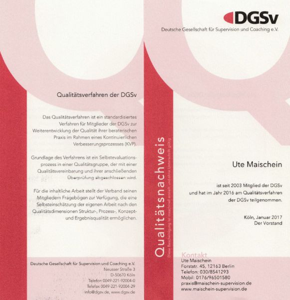 Regelmäßige Teilnahme an einer Balint Gruppe sowie an einer gruppendynamisch geleiteten Kontrollsupervisionsgruppe. Jährliche Teilnahme am Qualitätsverfahren der DGSv.